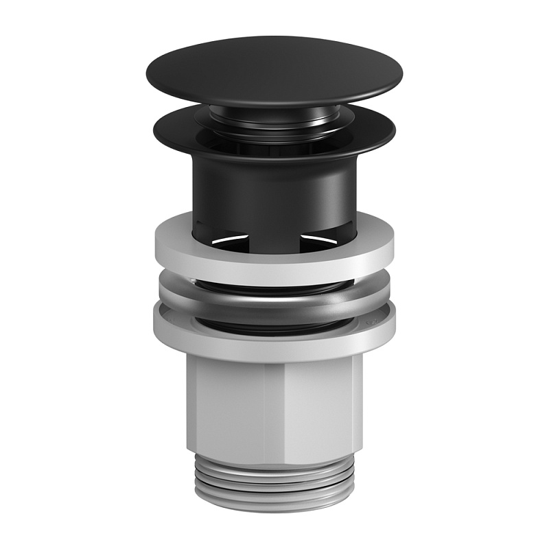 Донный клапан с отверстием для подключения перелива, позволяющего выпускать воду из раковины при ее переполнении через отверстие в нижней части перелива. Размер (Ш/Г/В): 64x64x102 мм. Материал - латунь, пластик. Цвет - черный. Тип донного клапана - нажимной. Имеет соединение G1 1/4.