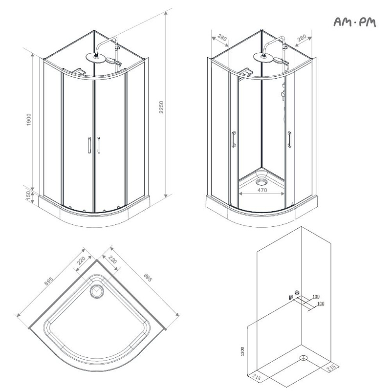 Душевая кабина бренда AM.PM коллекции Above без крыши с верхним тропическим душем представляет стильное решение для вашей ванной комнаты. Душевая кабина отлично впишется в ваш интерьер. Форма кабины - 1/4 круга. Цвет профиля - черный матовый. Размер (Ш/Г/В): 895x895x2250 мм. Высота поддона - 150 мм. Материал задних стенок - стекло. Материал дверок - прозрачное стекло. Толщина стекла - 4 мм.