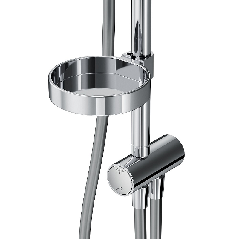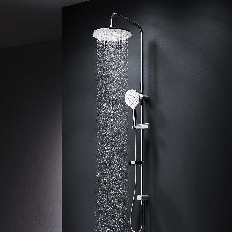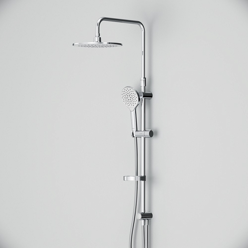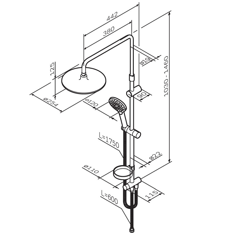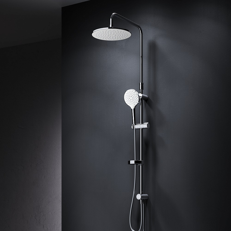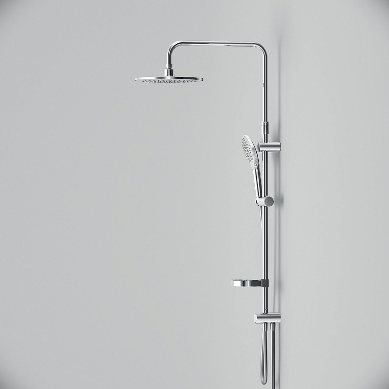 В комплектацию душевой системы входят: тропический душ, ручной душ, полочка, держатели штанги и душа. Длина душевой штанги - 1030-1460 мм. Длина душевого шланга - 1750 мм. Размер ручного душа - 120 мм. Диаметр верхнего душа - 254 мм.