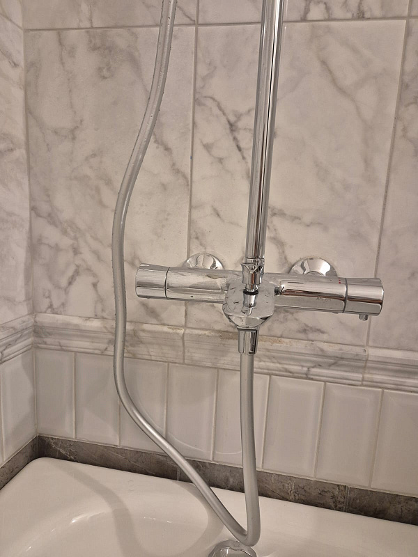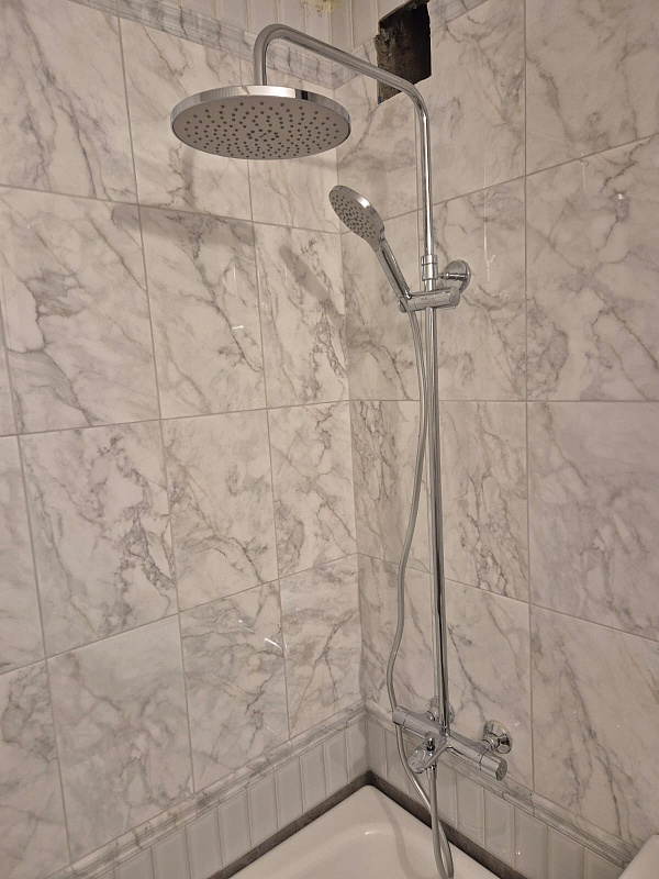 В комплектацию душевой системы входят: тропический душ, ручной душ, смеситель с изливом, эксцентрики, держатели штанги и душа. Длина душевой штанги - 1030-1460 мм. Длина душевого шланга - 1750 мм. Размер ручного душа - 120 мм. Диаметр верхнего душа - 250 мм.