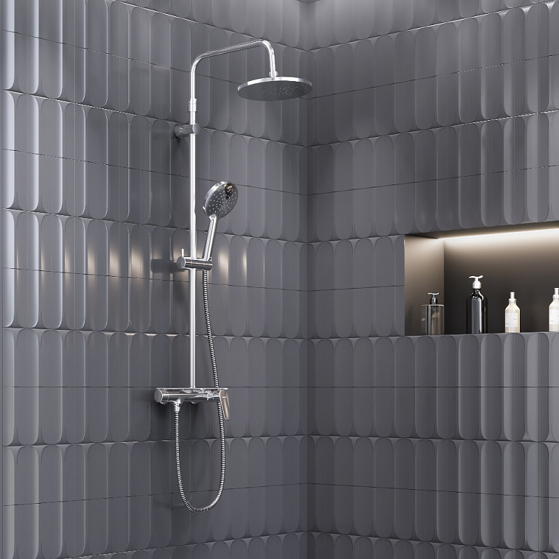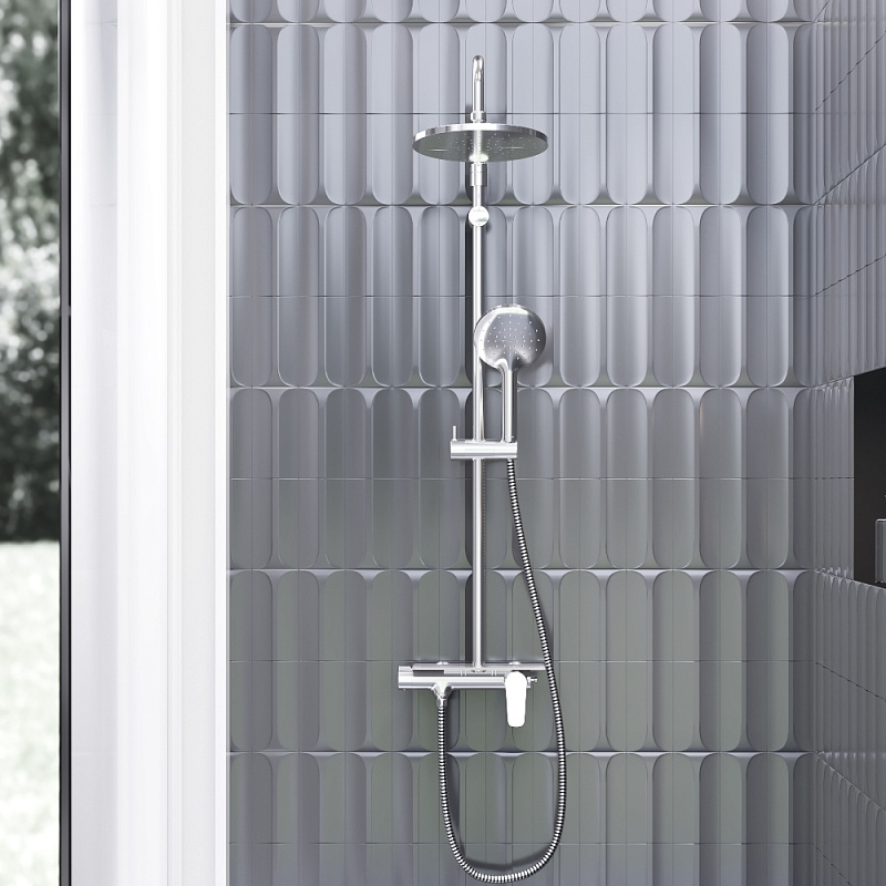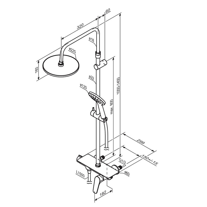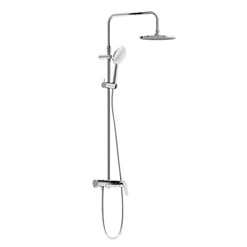 В комплектацию душевой системы входят: тропический душ, ручной душ, смеситель, эксцентрики, держатели штанги и душа. Длина душевой штанги - 1050-1450 мм. Длина душевого шланга - 1500 мм. Размер ручного душа - 120/25 мм. Диаметр верхнего душа - 225 мм.