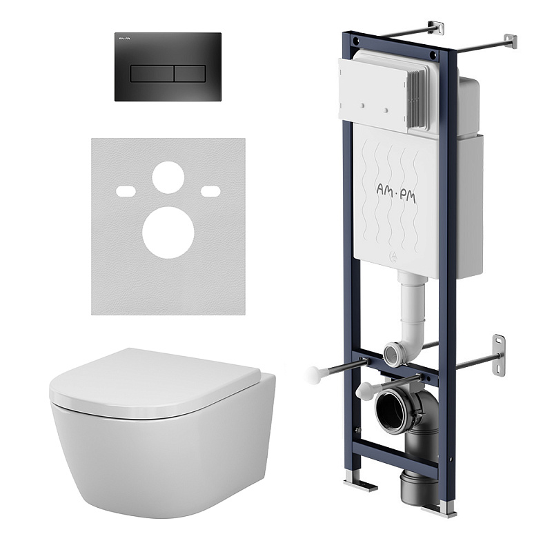 Унитаз подвесной с инсталляцией AM.PM Libre IS110338.601900 сиденьем микролифт, черной механ. клавишей