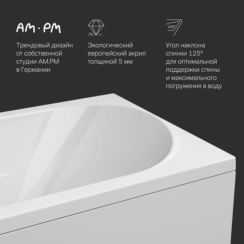 Включите в комплект, обеспечивающий надежность, каркас для ванны 150 AM.PM Sense W76A-150-070W-R (установка ванны без каркаса не допускается производителем). Кроме того, вы можете добавить в заказ фронтальную панель 160x70 AM.PM W76A-160-070W-P, закрывающую пространство под ванной, слив-перелив AM.PM W90A-000-OFI.
