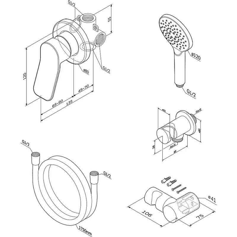 Размер смесителя (Ш/Г/В): 150x140x180 мм. Размер ручного душа - 120 мм. Размер держателя лейки ручного душа (Ш/Г/В): 50x65x50 мм. Длина душевого шланга - 1750 мм. Резьбовое соединение - G1/2. Материал встраиваемой душевой системы - латунь, ABS-пластик, нержавеющая сталь. Цвет системы - хром.